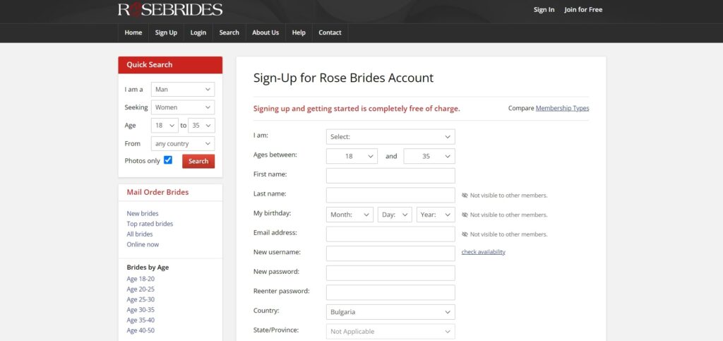 - Go to Rosebrides.com, look for the ‘Join for Free’ button on the top right corner, and click on it. You’ll fill out a pretty common form. Add your name and Email, date of birth, where you live, confirm you’re 18 or older and that you’re okay with the site’s rules and privacy stuff.